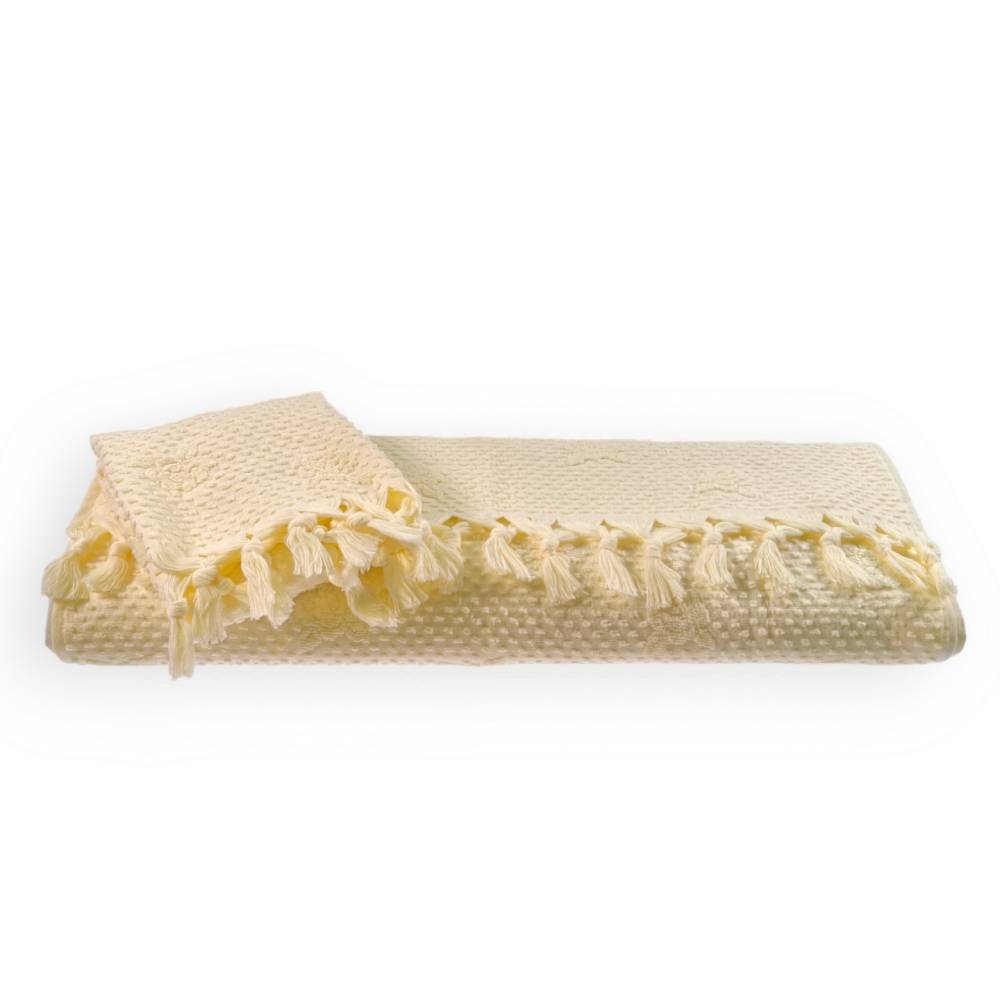 Das Handtuch und das Gästetuch sind aus 450 g/m² reinem Baumwoll-Frottee. mit Fransen.