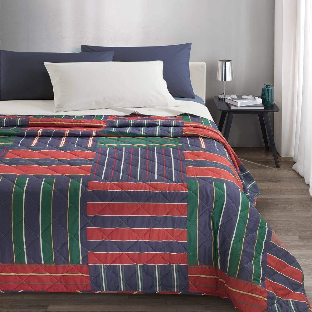 Ein lebendiger Patchwork-Effekt mit Regimental, der neuen gesteppten Tagesdecke von Gabel, bedruckt auf Sweet Touch-Stoff, weichem Jacquard-Twill mit 58 Fäden pro cm² und Polsterung aus weicher, hypoallergener Polyesterfaser von 80 g/m².