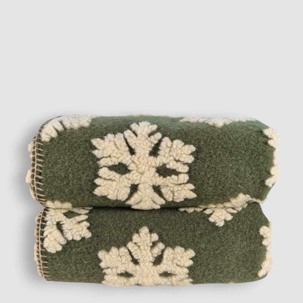 Entdecken Sie die Kuscheldecke aus gekochter Wolle mit Schneeflockenmuster auf lodengrünem Grund. Sie ist weich und warm, misst 150 x 170 cm und ist perfekt, um Ihrem Wohn- oder Schlafzimmer Gemütlichkeit und Stil zu verleihen.