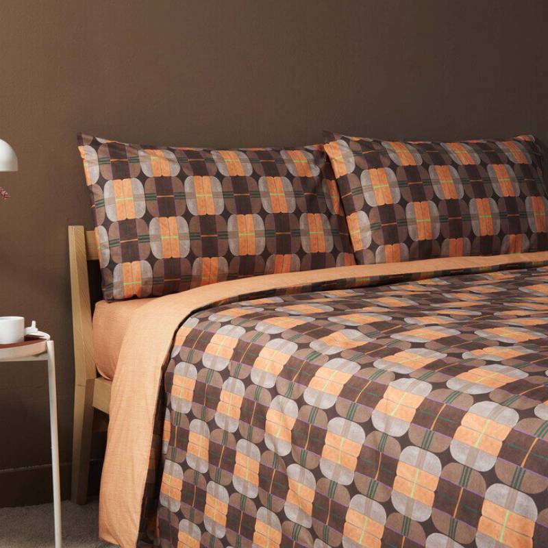 Bassetti GLOBES Bettbezug mit geometrischem Muster in Orange- und Brauntönen im Vintage-Stil, der an Drucke der 70er Jahre erinnert. Der Anzug besteht aus hochwertiger Baumwolle, die den Produkten Komfort und Wohlbefinden sowie Verschleiß- und Waschbeständigkeit verleiht.