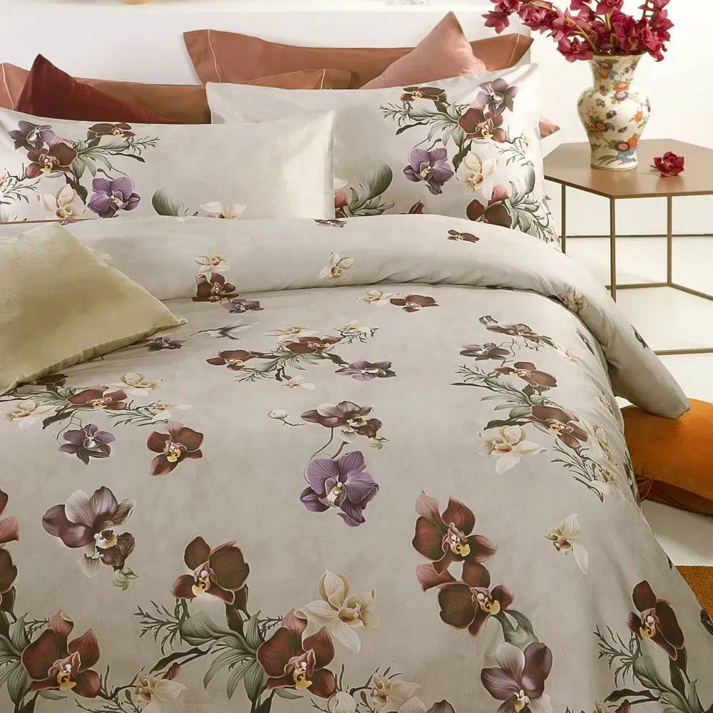 Die Herbst-Winter-Kollektion 2024 von Tessitura Randi bietet dieses wunderschöne Bettbezug-Set mit Kissenbezügen mit einem hochauflösenden Digitaldruck mit einem Blumenmotiv aus der BLOOM-Kollektion in Burgundertönen auf einem zarten taubengrauen Hintergrund auf einem kostbaren Satinstoff aus reiner Baumwolle.