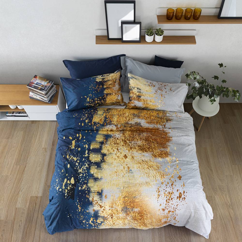 Das elegante Muster in Blau- und Goldtönen erinnert an einen nächtlichen Sternenhimmel und ist auf reine Baumwolle mit leuchtenden und unveränderlichen Farben im Laufe der Zeit gedruckt, um Weichheit und traumhafte Farben zu verleihen.