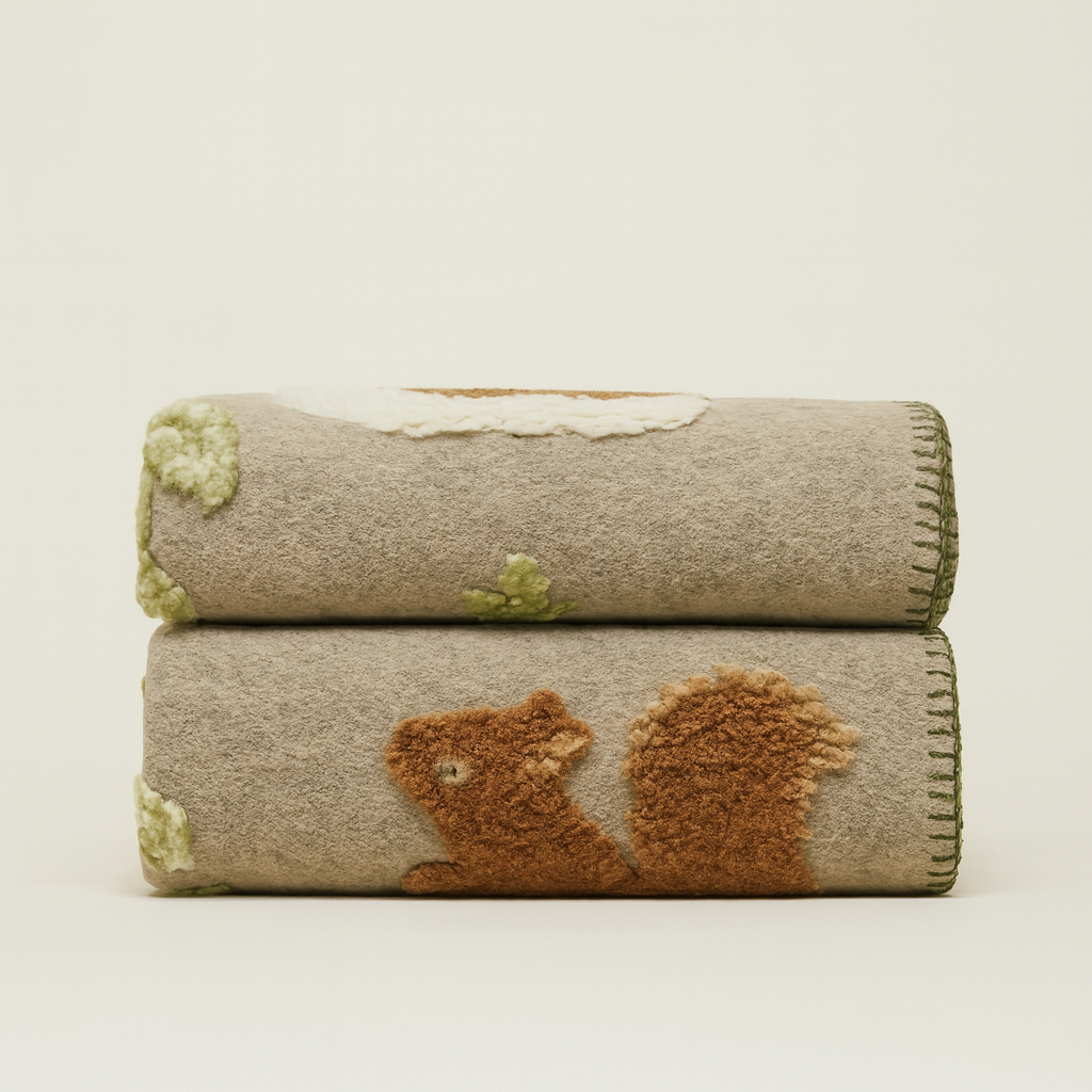 150 x 170 cm große Decke aus gewalkter Wolle mit Tannenbaum- und Eichhörnchenmotiv auf taubengrauem Hintergrund und Bordüre im Steppstich . Ein warmes, atmungsaktives und strapazierfähiges Accessoire, perfekt zur Verschönerung Ihres Wohnzimmers oder zur Gestaltung einer gemütlichen Leseecke.