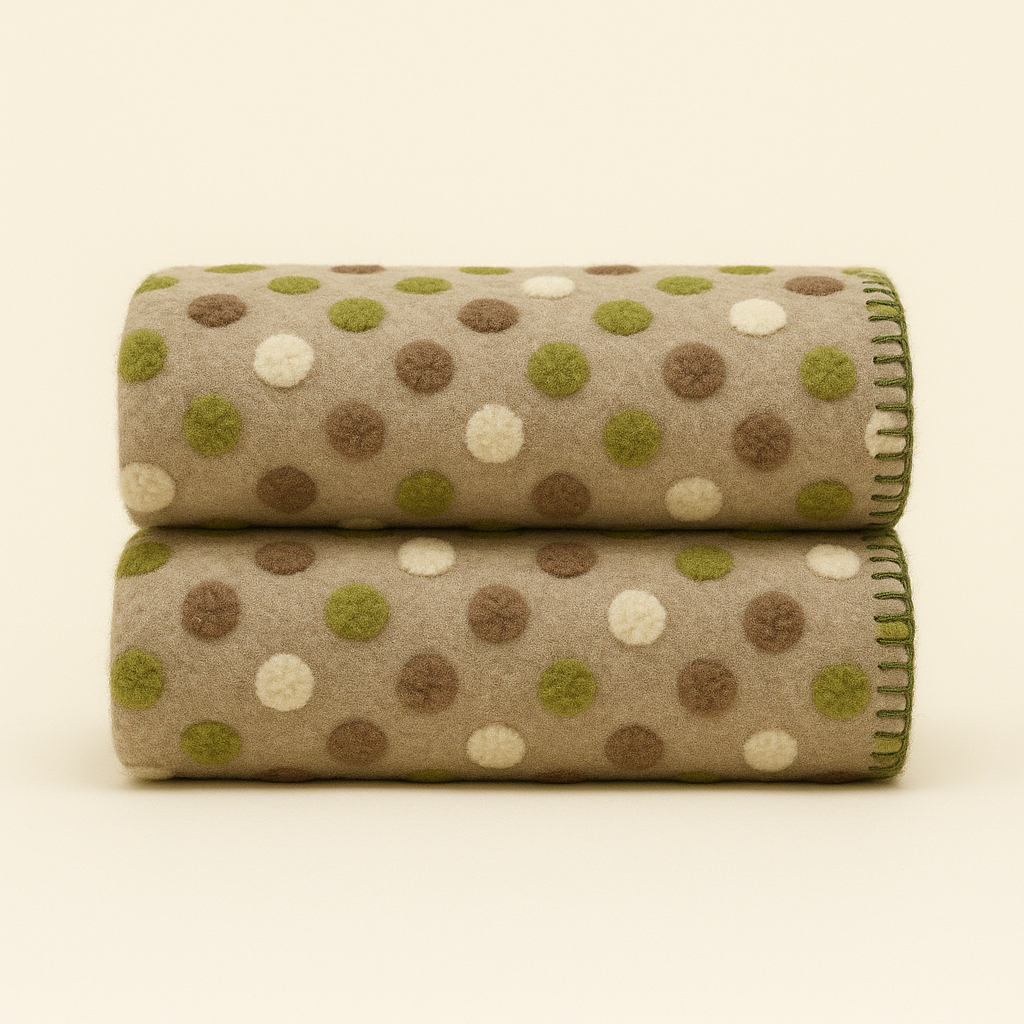 Überwurf aus gekochter Wolle, 150 x 170 cm , mit einem grün-braunen Tupfenmuster auf taubengrauem Hintergrund und Steppstichbesatz . Ein warmes, atmungsaktives und langlebiges Accessoire, perfekt zur Verschönerung Ihres Wohnzimmers oder zur Schaffung einer gemütlichen Leseecke.