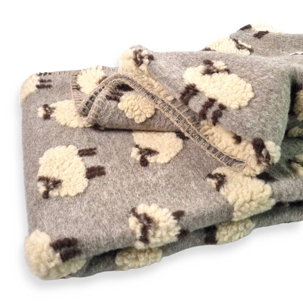 Weiches Wollwalk-Plaid mit Schäfchenmotiv in Taupe. Aus 60% Wolle und 40% Polyester, angenehm warm und dekorativ. Ideal für Sofa, Bett und als Geschenk. Made in Italy.